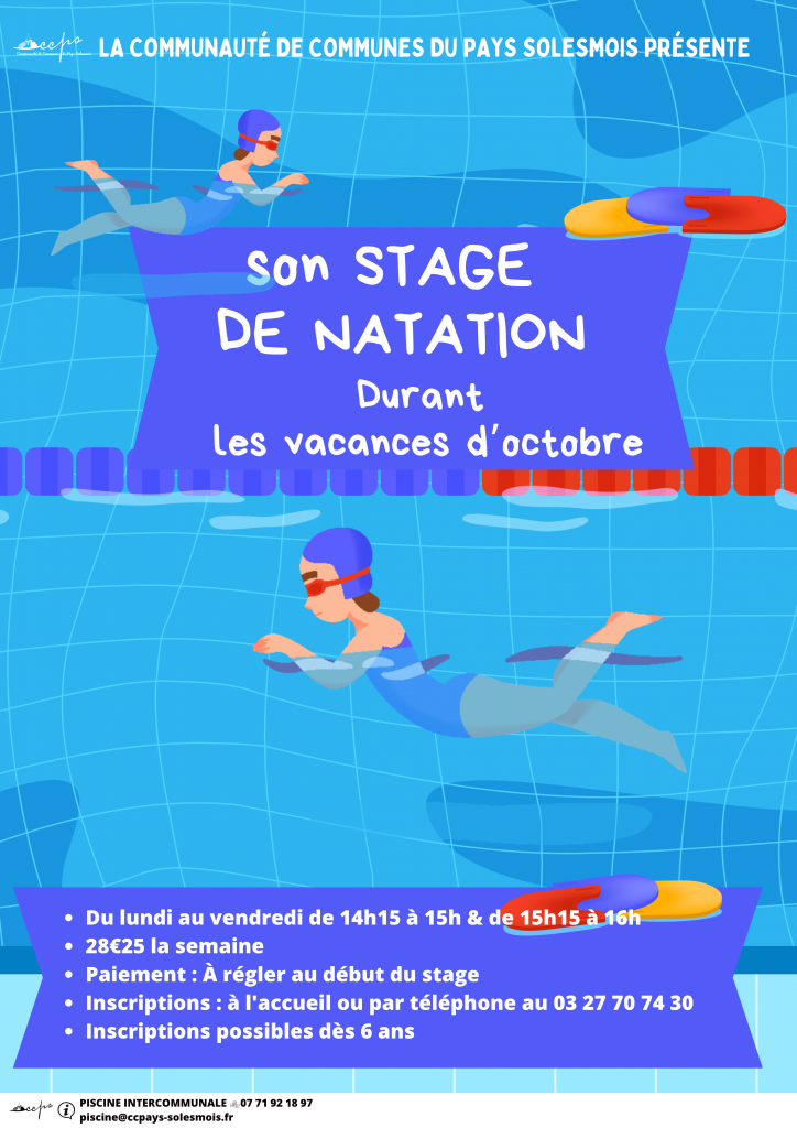 La Communauté de Communes du Pays Solesmois est heureuse de proposer un nouveau stage de natation pendant les vacances d’octobre, une belle occasion pour les enfants à partir de 6 ans de perfectionner leurs techniques de nage dans un environnement sécurisé et encadré par des professionnels qualifiés !